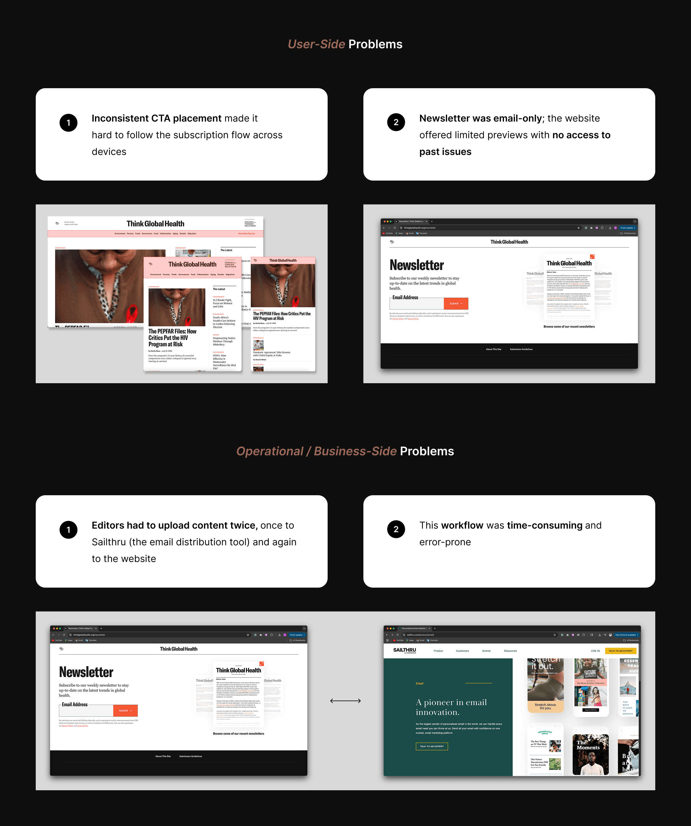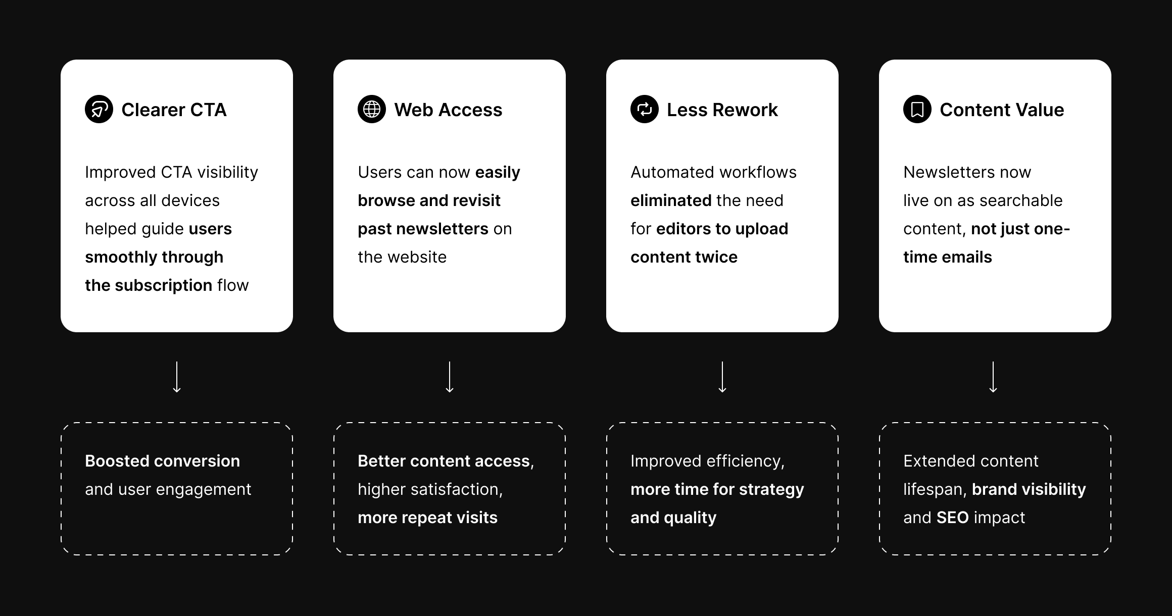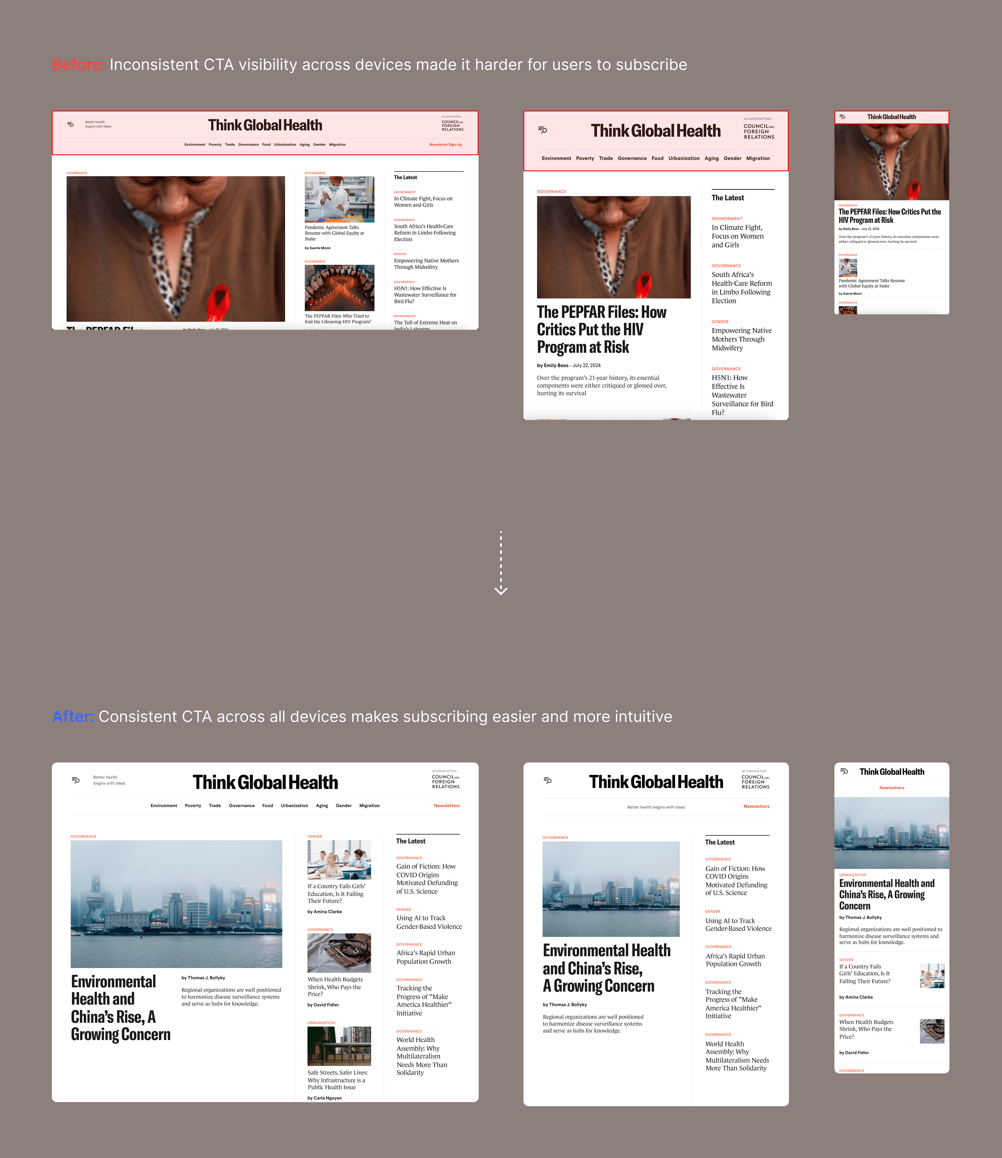 These updates improved clarity, access, and efficiency for both users and editors. The final designs were implemented with stakeholder alignment, and measurable outcomes were tracked after launch.