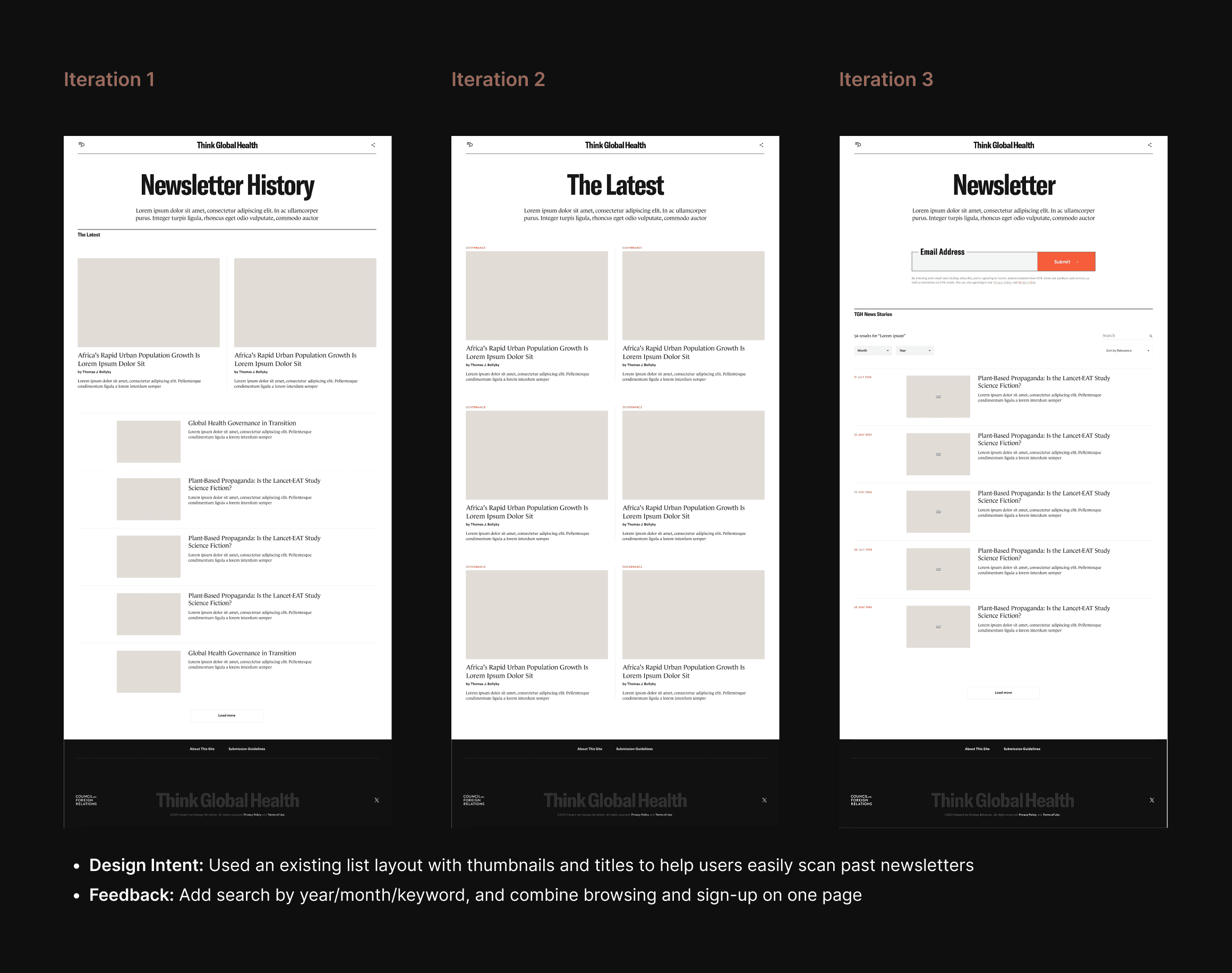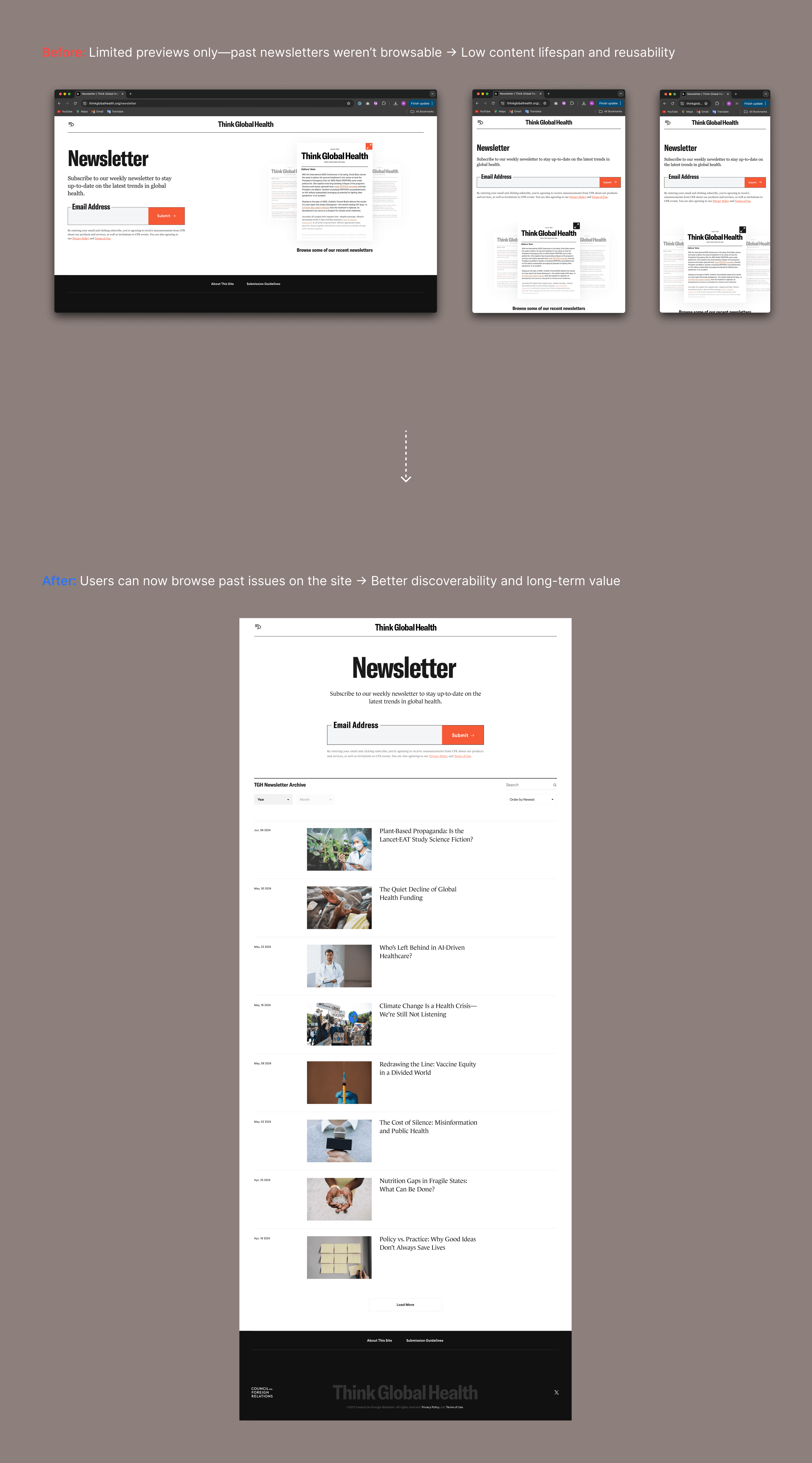 The subscribe CTA is now fixed at the top of every device, and a new archive section at the bottom of the page allows users to browse past newsletters.